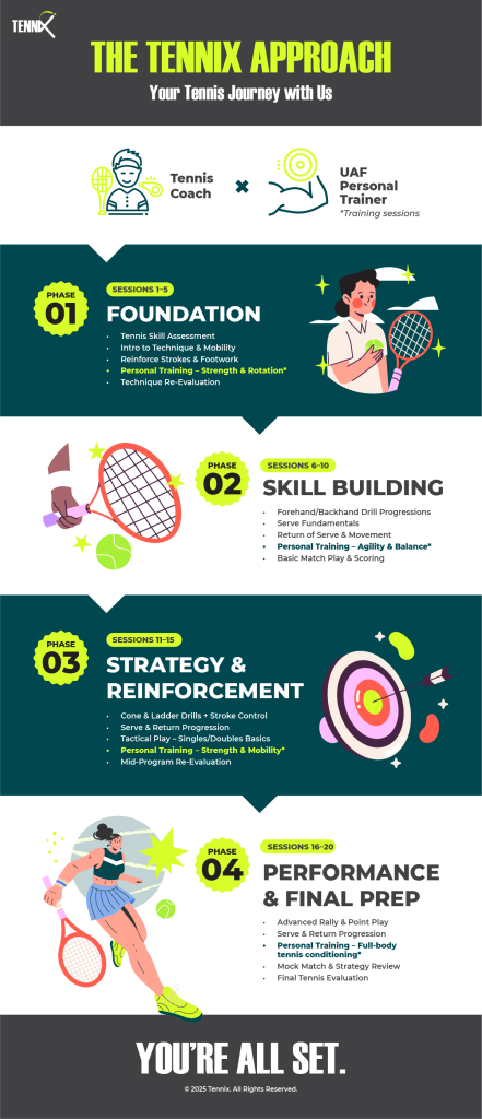 We design an individualized training regimen that aligns with your tennis goals, fitness level, and experience.